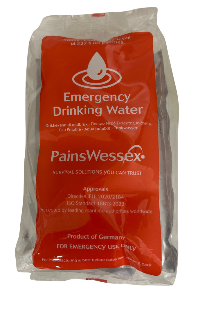 Dit lang houdbaar drinkwater van Pains Wessex is speciaal ontwikkeld voor gebruik in noodsituaties en wordt wereldwijd toegepast op reddingsboten en -vlotten. Elke verpakking bevat vier zakjes van 125 ml (dus 500 ml totaal). Deze zijn gemaakt van stevige, waterdichte aluminiumfolie die het water tot wel vijf jaar houdbaar houdt. De zakjes zijn makkelijk te vervoeren, op te slaan en kun je snel gebruiken: je kan direct uit het zakje drinken.