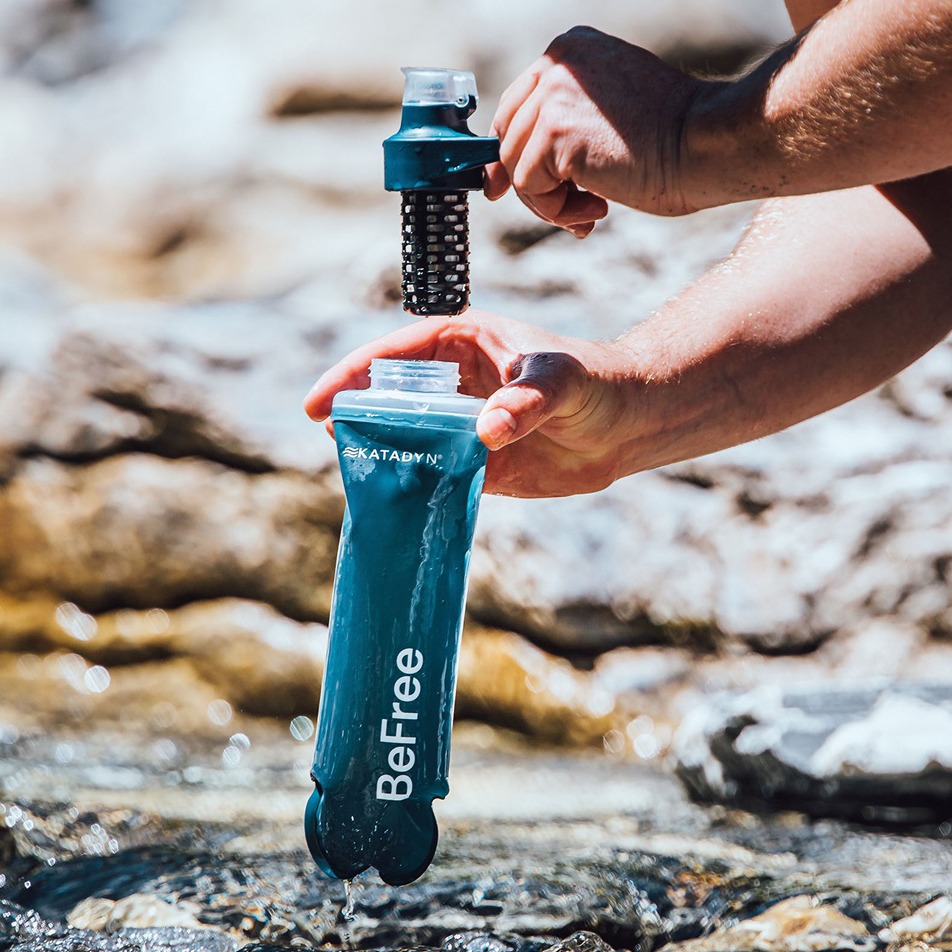 Katadyn BeFree AC Slate Blue is een superlicht, compact waterfilter met een opvouwbare drinkfles. Vanwege het flexibele materiaal is de drinkfles eenvoudig op te rollen als je het filter in je tas wilt stoppen. Het waterfilter is verkrijgbaar met een 0,5 liter of 1 liter waterzak.